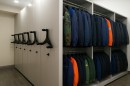 Стеллажи со штангами для хранения образцов тканей, одежды на плечиках.