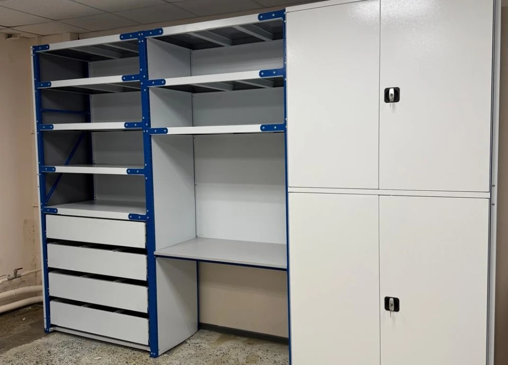 Стеллажный комплекс для промышленного предприятия. В составе идут стеллажи, верстаки, столы, тумбы, ящики и стойки с дверями.