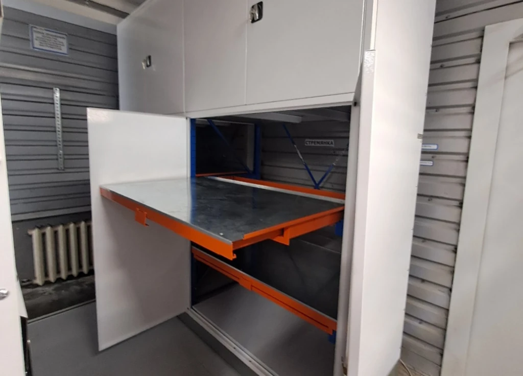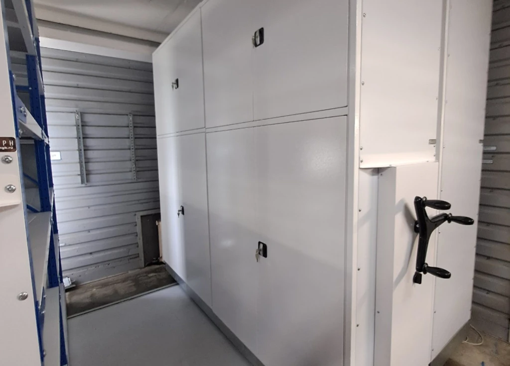Среднегрузовые передвижные стеллажи закрывающиеся дверями жалюзи для склада, цеха или производства.